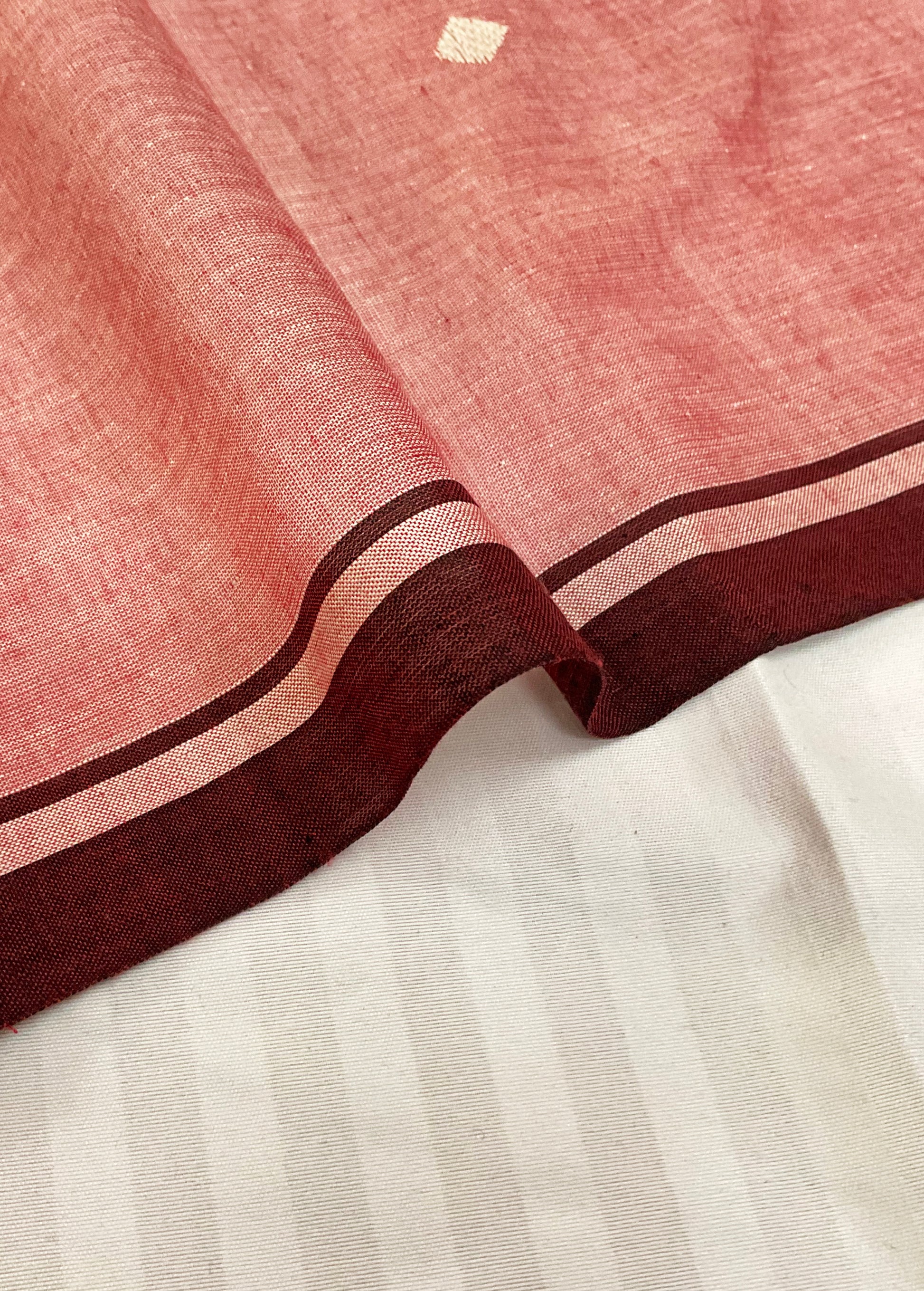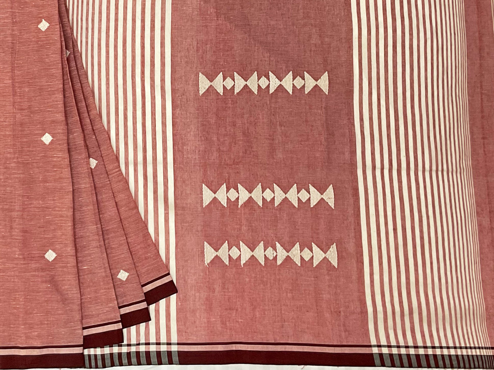 "Blush Harmony" is a sophisticated Khadi cotton saree that beautifully blends traditional craftsmanship with timeless elegance. The handwoven saree features a refined blend of soft pink tones adorned with intricate white geometric motifs and stripes. The delicate white borders and simple pallu add to its understated beauty. Crafted from soft, breathable cotton, this saree ensures comfort while making a graceful fashion statement, perfect for any occasion.