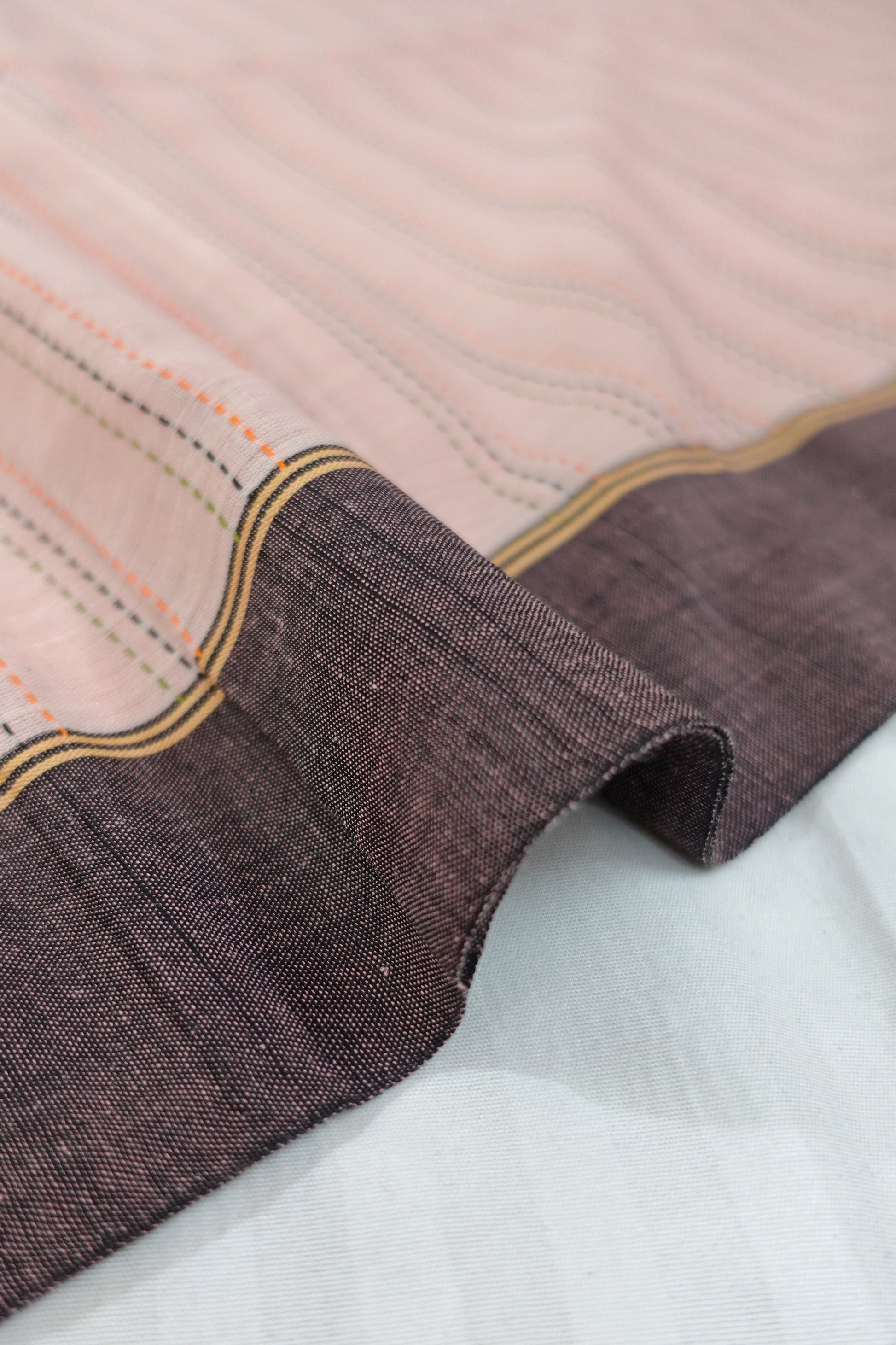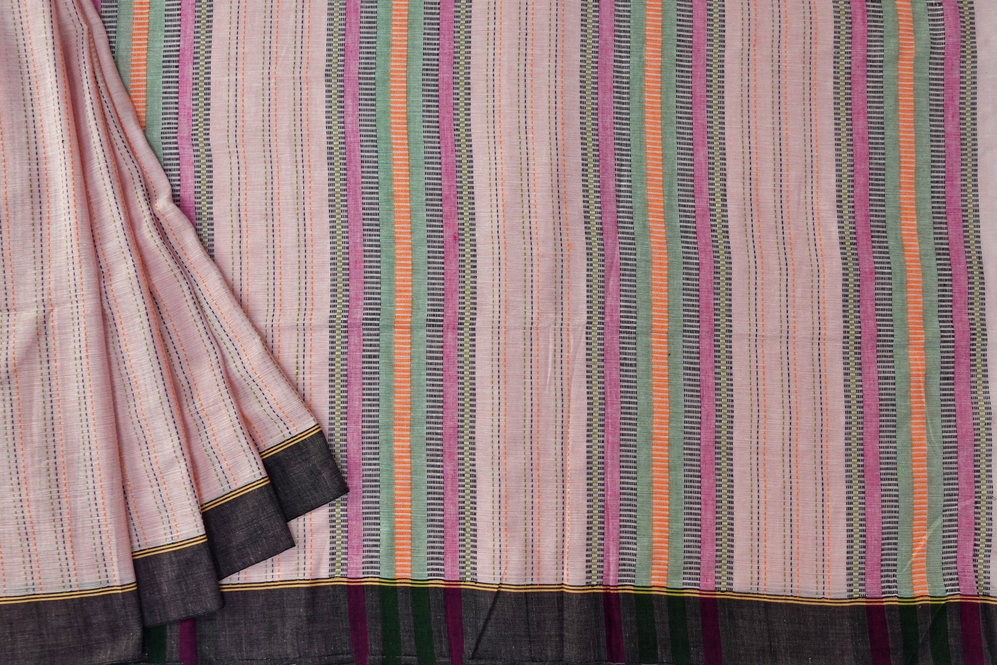 Step into a world of soft elegance with the Blush Spectrum saree. This delicate pastel pink saree features a vibrant multicolored striped pallu that adds a lively, contemporary touch. The rich brown and black border frames the saree beautifully, while the stripes that run across the body enhance its modern charm. The Blush Spectrum saree combines a subtle pastel base with dynamic patterns, making it a distinctive choice for those who appreciate a blend of gentle hues and bold design.