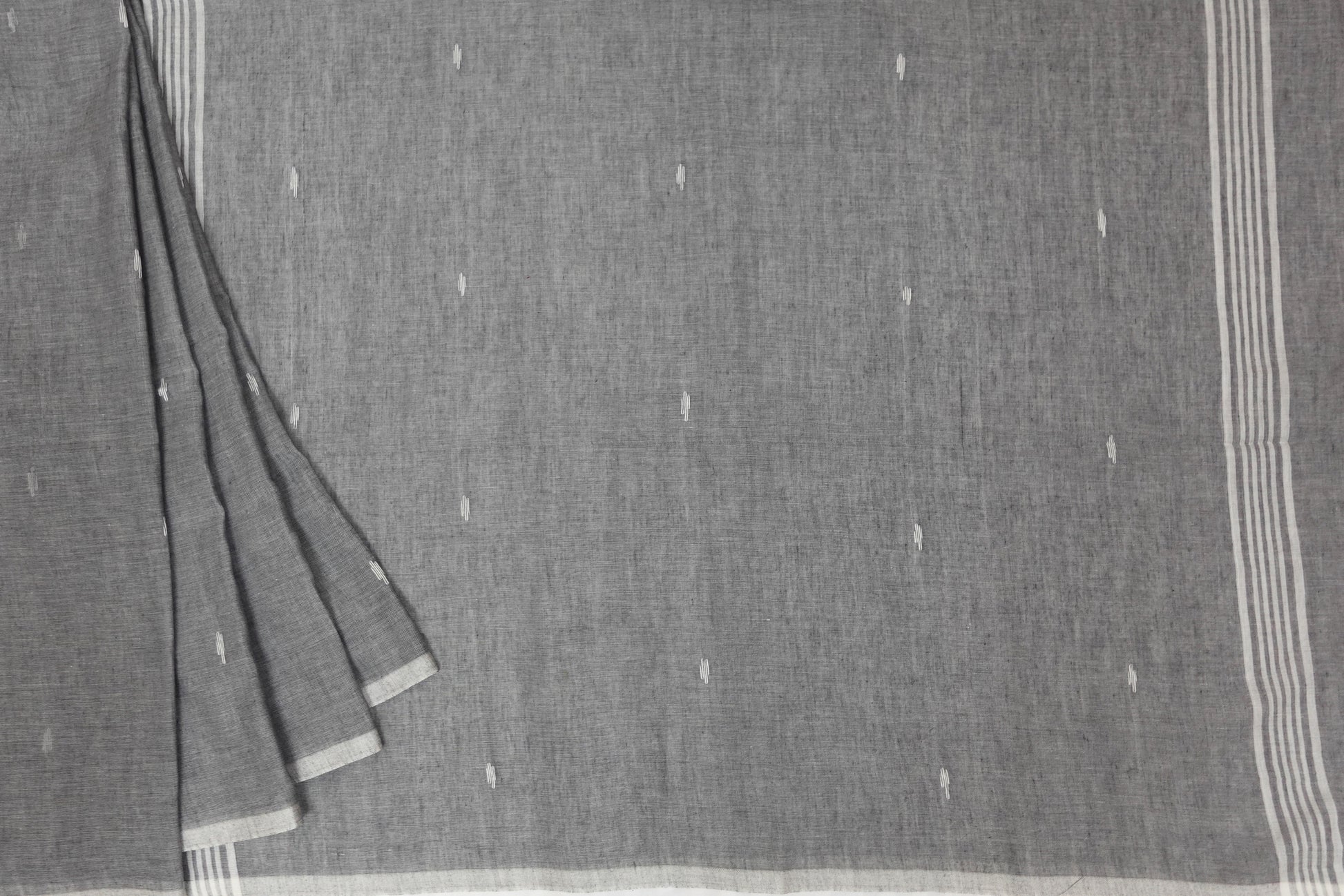 Embody subtle elegance with the Frosted Grace saree. This handwoven mul cotton saree presents a classic plain body and a white striped pallu, offering a timeless design. Small, intricate motifs add a delicate touch of charm, making the Frosted Grace a perfect choice for those who appreciate understated beauty.