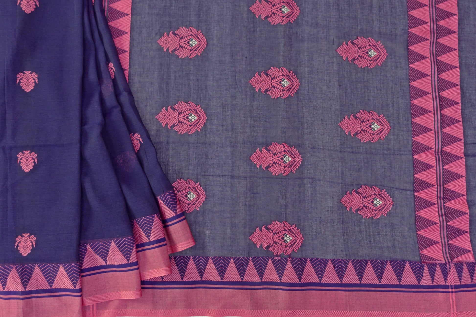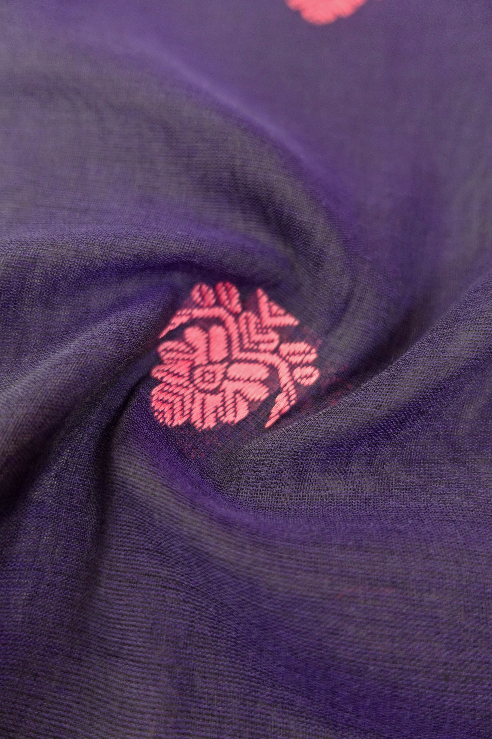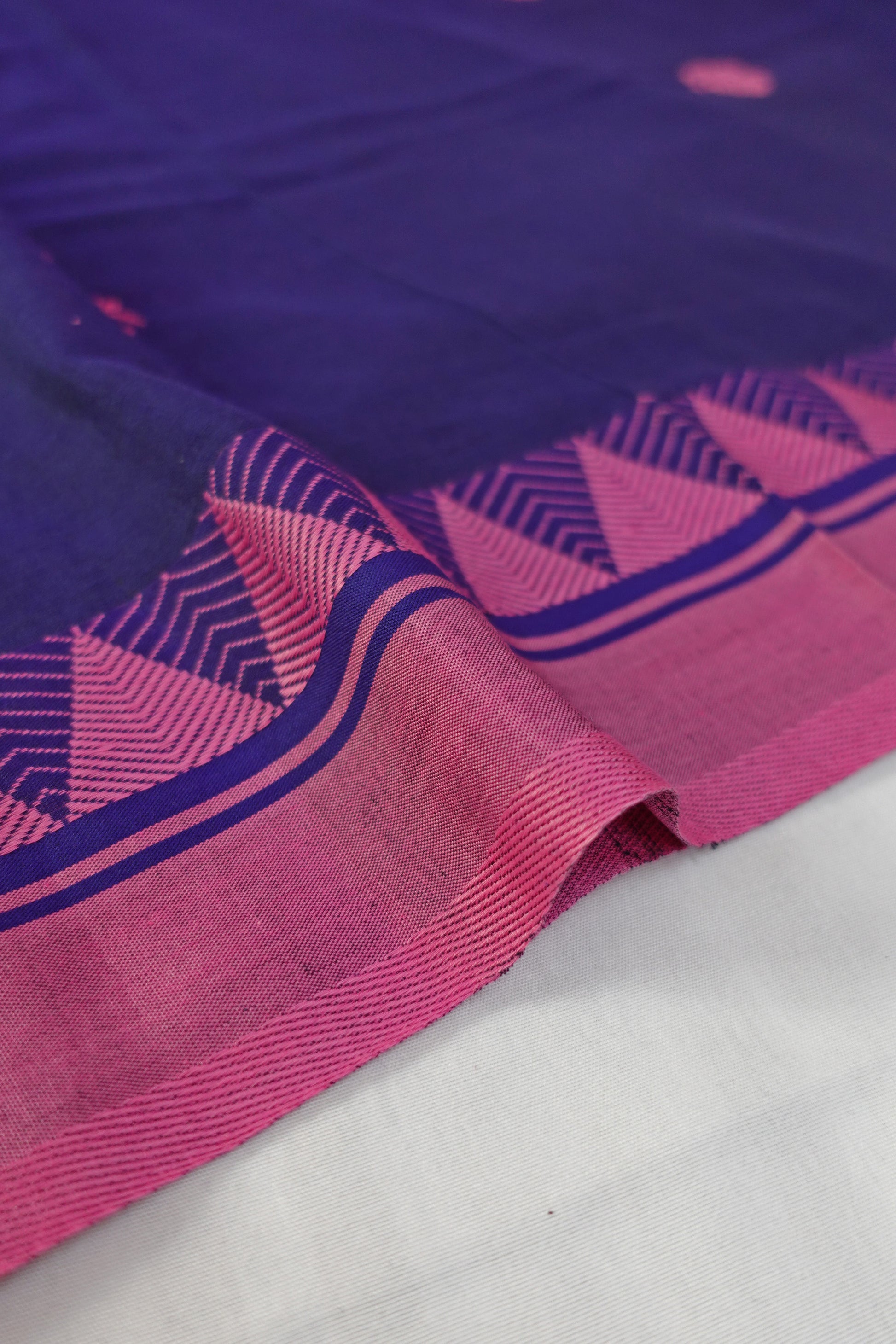 Embrace the cosmic elegance of the Nebula Aurora saree. This handwoven masterpiece features a deep, vibrant navy blue body that radiates sophistication. The pallu showcases delicate pink floral motifs, adding a touch of grace and charm. A geometric border in contrasting hues introduces a modern flair, enhancing the saree’s overall appeal. With its captivating blend of rich navy and soft pink, the Nebula Aurora saree seamlessly merges traditional artistry with contemporary style, making it an exceptional choice for any special occasion.