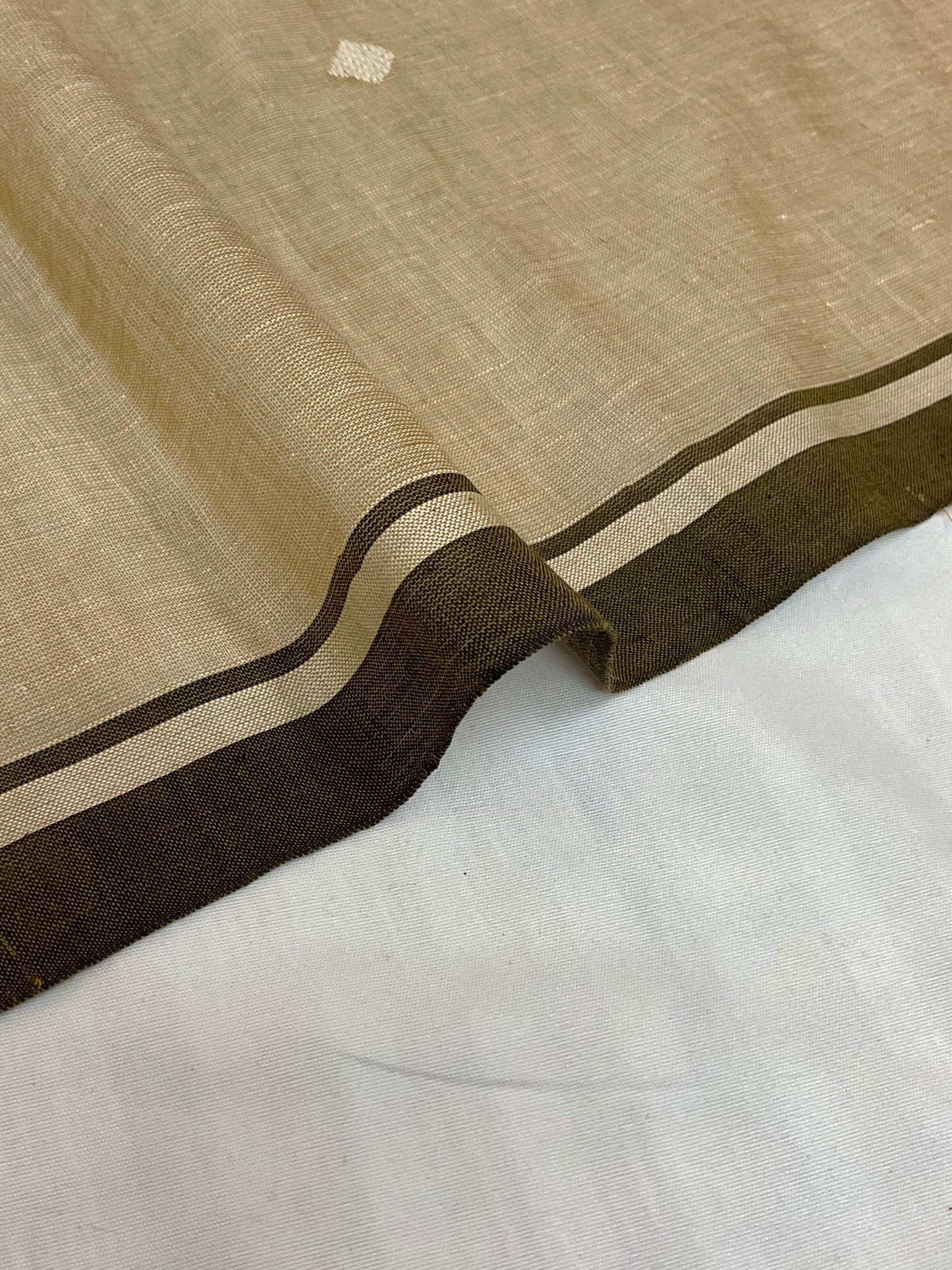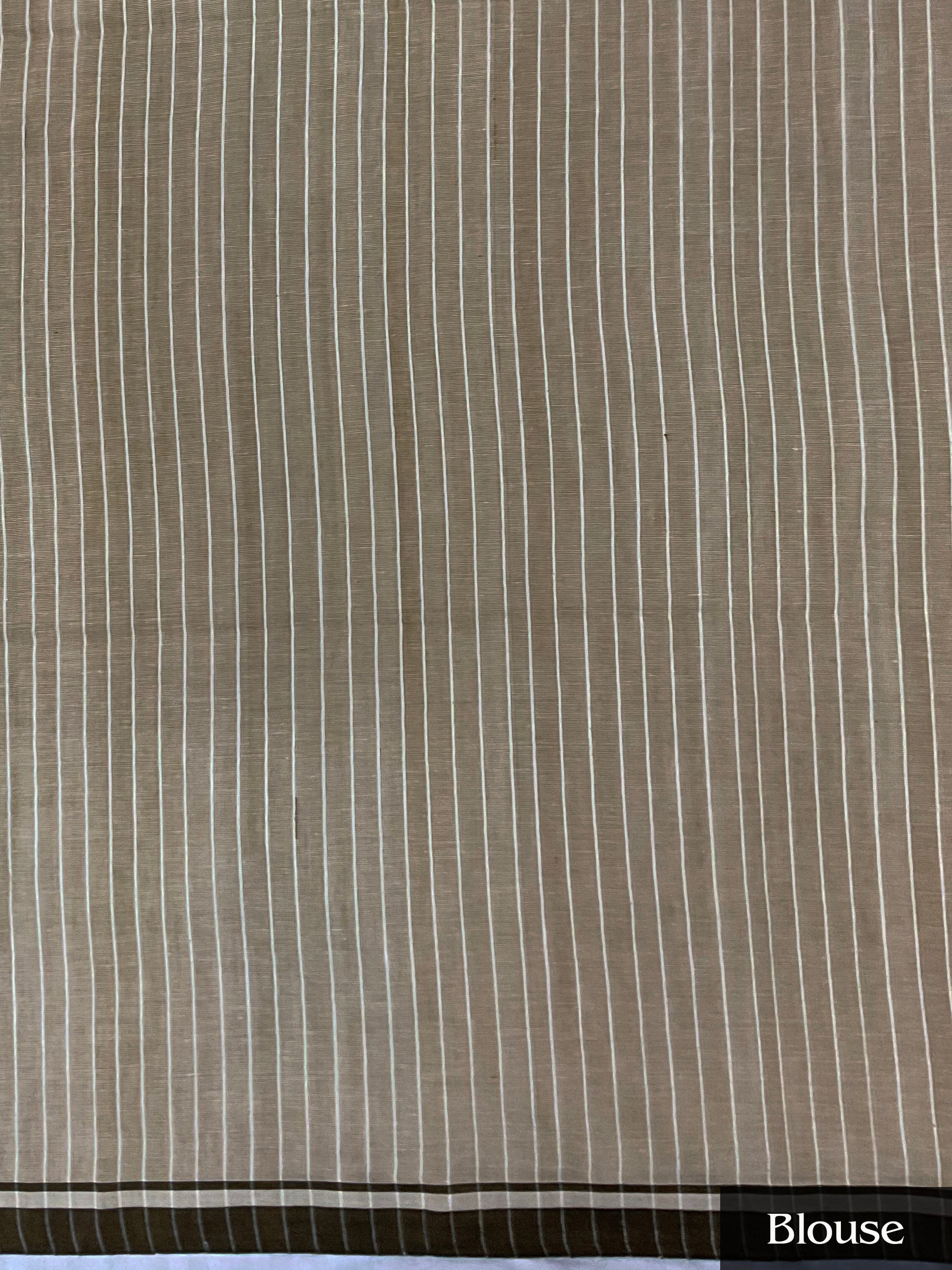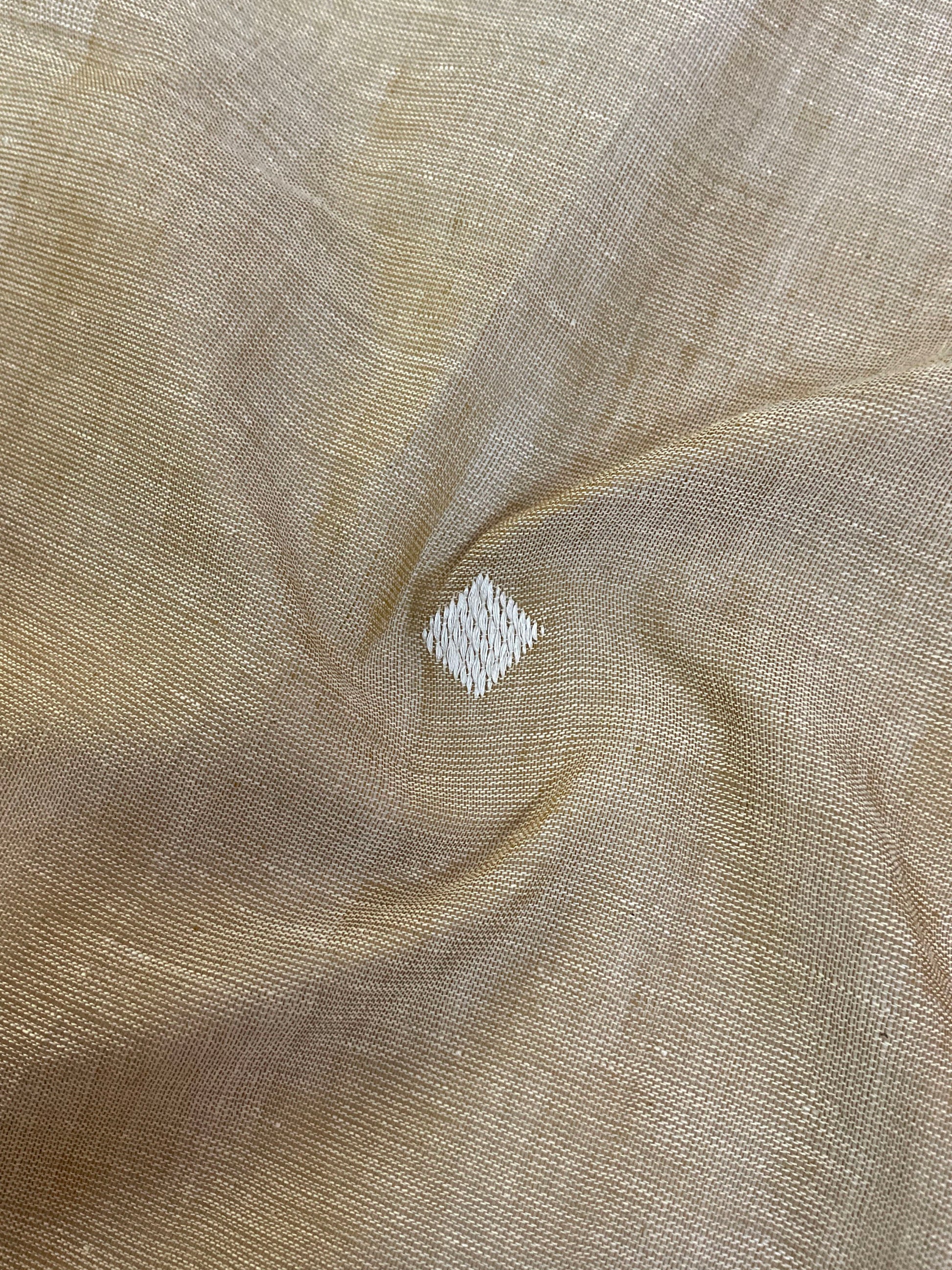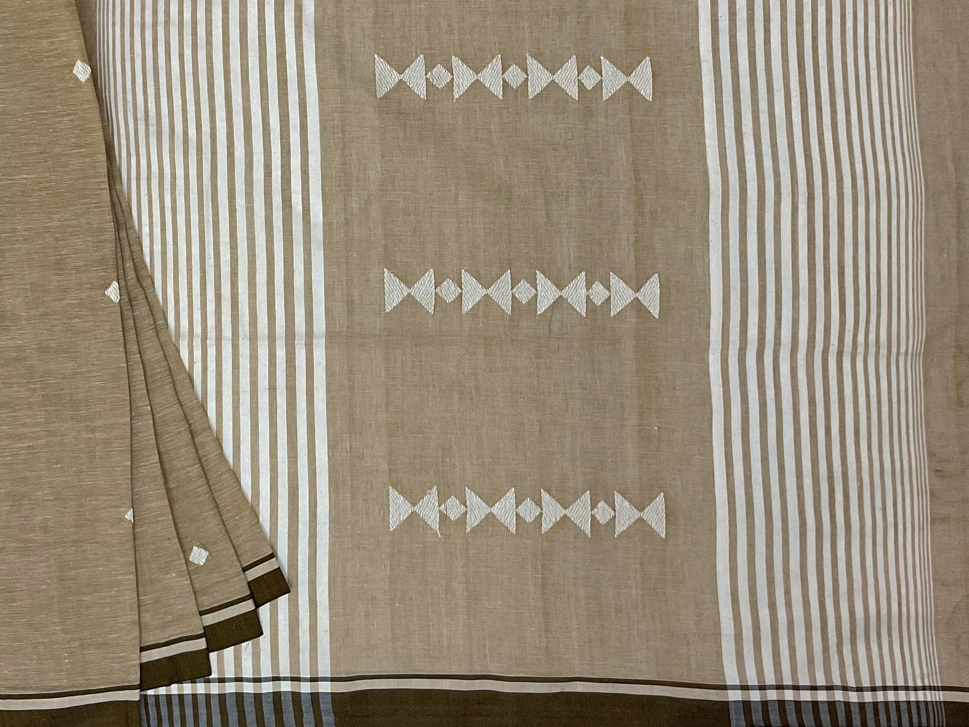 "Sandstone Elegance" is a sophisticated Khadi saree that beautifully blends traditional craftsmanship with timeless charm. The handwoven saree features a harmonious blend of beige tones adorned with intricate white geometric motifs and stripes. The delicate white borders and simple pallu add to its understated beauty. Crafted from soft, breathable cotton, this saree ensures comfort while making a graceful fashion statement, perfect for any occasion.