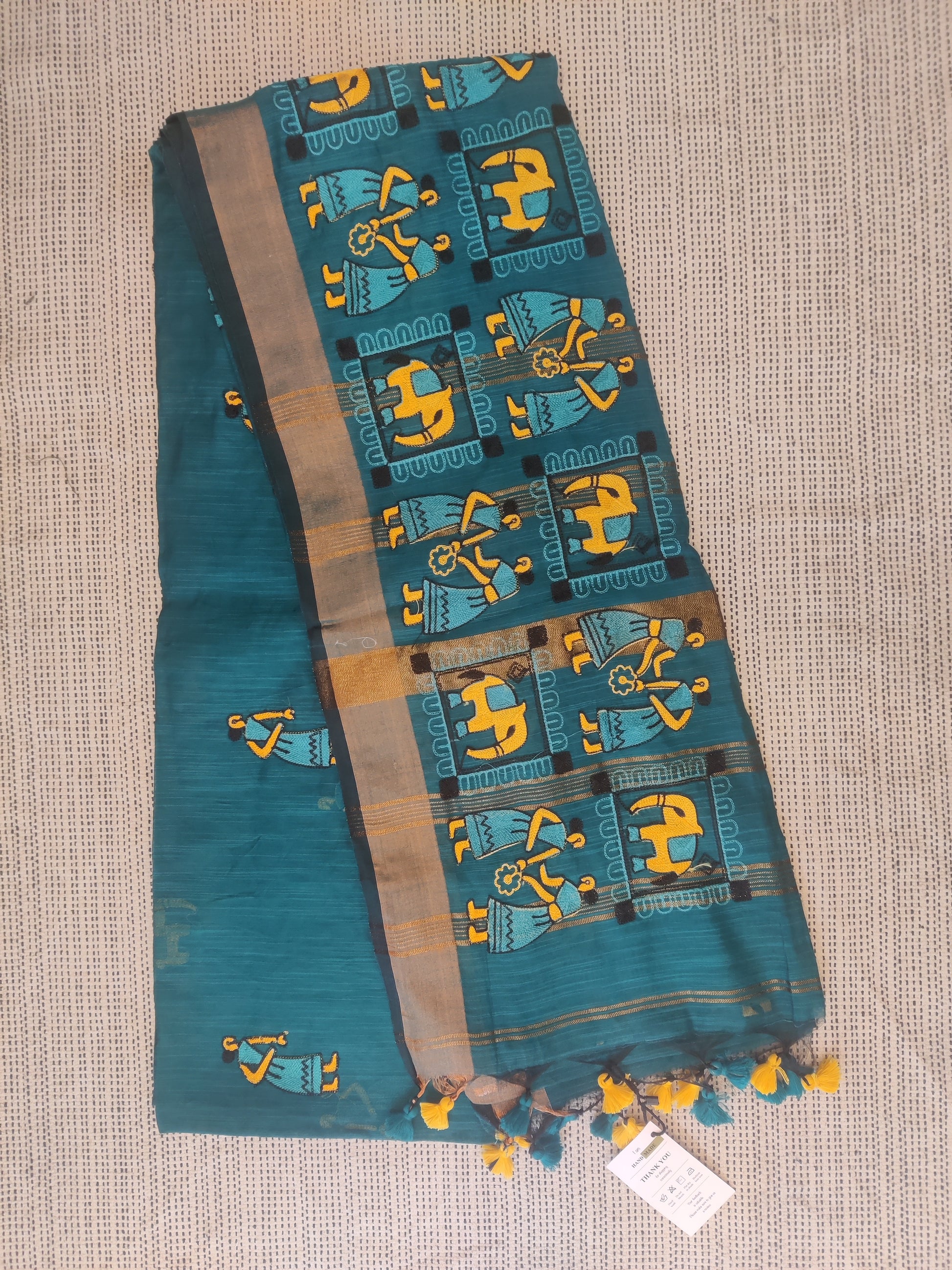 Crafted from textured slub cotton, the saree features all-over machine embroidery of traditional Warli human figures and elephants, celebrating tribal storytelling through thread. The fabric offers a soft yet structured drape, perfect for festive occasions, cultural events, or statement everyday wear.