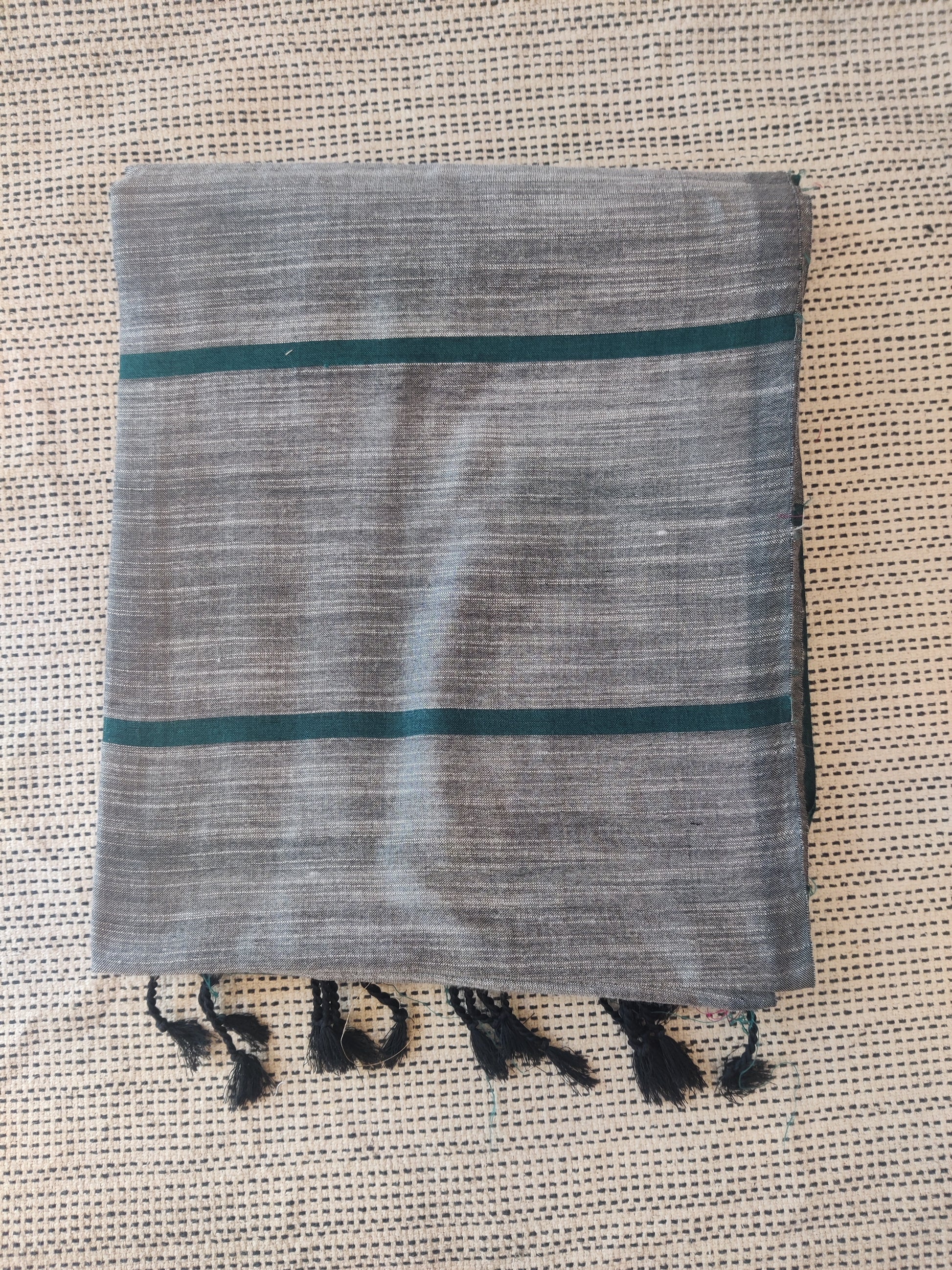 Soft, breathable, and effortlessly elegant – this Mul Khadi saree features a subtle grey body with delicate blue-green thread stripes, paired with a plain blue-green pallu that adds depth and contrast. Lightweight and easy to drape, it’s perfect for all-day comfort and understated style. Comes with a matching running blouse piece.